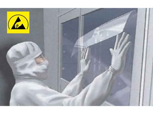 Pellicola trasparente autoadesiva in poliestere dissipativo per il rivestimento di superfici isolate.